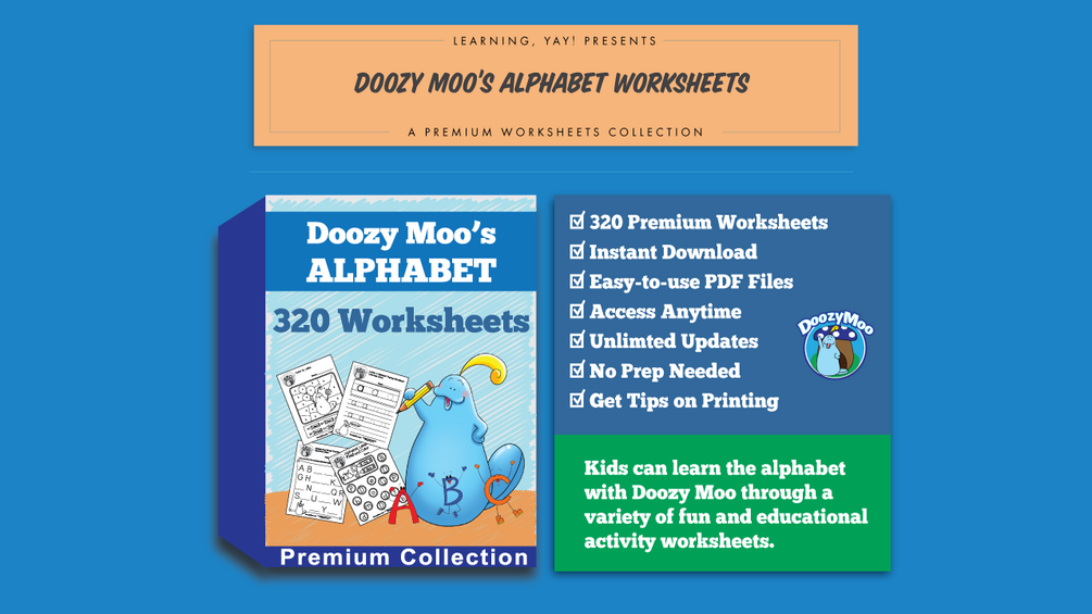 Learn the alphabet with Doozy Moo! Get 320 alphabet worksheets designed to help kids learn their ABCs through a variety of fun and educational activities. This resource is great for teaching, assessment, or review.